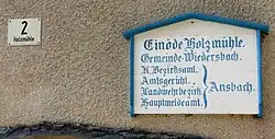 Im Rahmen des Gemeindeedikts wurde Holzmühle dem 1808 gebildeten Steuerdistrikt Wiedersbach zugewiesen. Sie gehörte auch der 1810 gegründeten Ruralgemeinde Wiedersbach an.[14] Die seit 1796 bestehende eybsche Patrimonialgerichtsbarkeit zu Wiedersbach-Rammersdorf endete 1842 durch Verzicht.[15] 1851 stellte die Holzmühle mit Georg Häslein den Bürgermeister der Gemeinde Wiedersbach.[16]