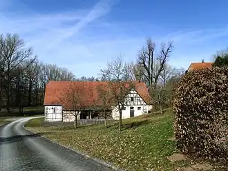 - Haus Nr. 1: ehemalige Holzmühle, Wohngebäude, zweigeschossiger Satteldachbau, mit Putzgliederungen und Fachwerkgiebel, 18. Jahrhundert, bezeichnet 1818; Scheune, massiver Satteldachbau, einseitig mit Krüppelwalm, mit Fachwerkgiebel, 1801.[19]