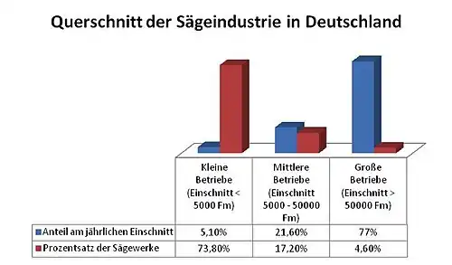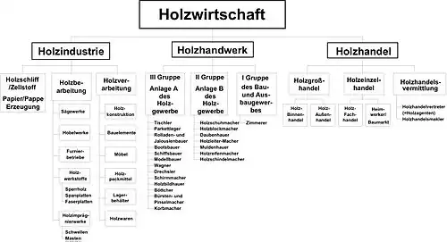 Der größte Teil der Holzwirtschaft in Deutschland ist mittelständisch und überwiegend handwerklich begründet. Dabei handelt es sich größtenteils um Familienbetriebe, die in ländlichen Regionen angesiedelt sind, wozu Sägewerke, Holzhandel, Möbel-, Verpackungs- und Fertigbauindustrien gehören. Es gibt nur wenige Betriebe, die eine großindustrielle Struktur aufweisen. Diese Großindustrien produzieren hauptsächlich im Bereich der Holzwerkstoffe und der Zellstoff- und Papierindustrie.