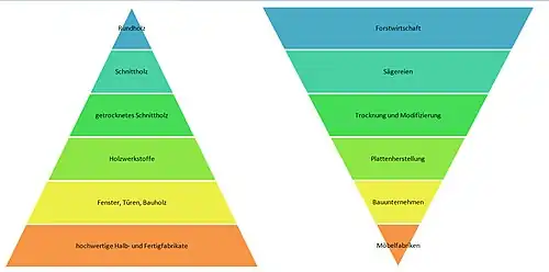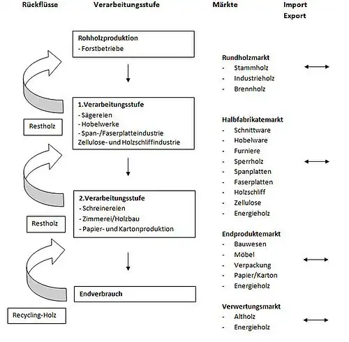 Die Holzwirtschaft erhält ihren Rohstoff aus der das Holz erzeugenden Forstwirtschaft, dem internationalen Holzhandel und zu einem kleinen Teil aus dem Recycling. Für die Produktion und Veredelung von Holzwerkstoffen zählt bei großen Unternehmen der Holzwerkstoffindustrie unter dem technischen und wirtschaftlichen Aspekt die Entwicklung von Maschinen- und Anlagensystemen zum Unternehmenszweck. Im Rahmen der holzverarbeitenden Prozesse fallen große Mengen an Nebenprodukten an. Diese werden als Kuppelprodukte weiter verarbeitet oder für die Gewinnung von Bioenergie genutzt (Kaskadennutzung).