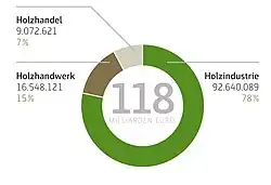 2011 gab es 93.624 Unternehmen der Holzindustrie in Deutschland. Sie erwirtschafteten 173,95 Mrd. Euro Umsatz und beschäftigten 1,042 Mio. Mitarbeiter. Die Abweichungen zur Grafik ergeben sich aus dem zeitlichen Abstand und dem Wegfall der Beschäftigten der Forstwirtschaft.[12]