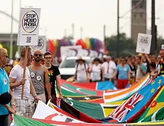 Homophobie (von altgriechisch homós „gleich“, und, über „Phobie“, von phóbos „Furcht, Schrecken, Flucht“) bezeichnet eine gegen lesbische und schwule Personen gerichtete soziale Aversion (Abneigung) oder Aggressivität (Feindseligkeit).[1] Homophobie wird in den Sozialwissenschaften zusammen mit Erscheinungen wie Rassismus, Fremdenfeindlichkeit oder Sexismus unter die Begriffe Queerfeindlichkeit und noch weiter unter gruppenbezogene Menschenfeindlichkeit gefasst und ist demnach nicht krankhaft abnorm bedingt. Als Lesbophobie wird ein sich mit Homophobie überschneidendes, sexistisches Verhalten gegenüber lesbischen Frauen bezeichnet, eine doppelte Diskriminierung der davon betroffenen Frauen.