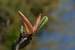Die wechselständigen, meist an den Enden der Zweige gehäuft angeordneten Laubblätter sind in Blattstiel und -spreite gegliedert. Der kurze Blattstiel ist 2 bis 3 Zentimeter lang. Die einfache, ganzrandige Blattspreite ist bei einer Länge von 20 bis 40 Zentimetern sowie einer Breite von 13 bis 25 Zentimetern verkehrt-eiförmig, mit gerundeter bis spitzer Spreitenbasis, und die Spitze ist gerundet, stumpf bis bespitzt. Die etwas bläulich, glauk gefärbte Blattunterseite ist flaumig behaart. Die Blattoberseite ist kahl.[2] Nebenblätter sind vorhanden und fallen bald nach dem Entfalten des zugehörigen Laubblattes ab.