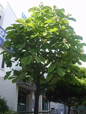 Magnolia obovata wächst als sommergrüner Baum und erreicht Wuchshöhen von 15 bis zu 30 Metern und einen Stammumfang bis etwa 1 Meter. Die Rinde junger Zweige ist rötlich und kahl. Die Borke ist grau. Die Winterknospen sind kahl.[2]