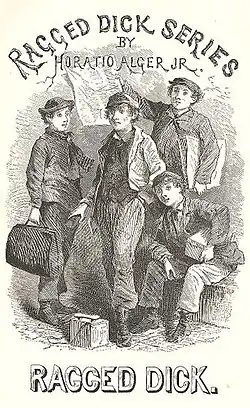 Der Umzug nach New York war ein Wendepunkt in Algers Karriere. Er wurde sofort in die Welt der verarmten jungen Stiefelputzer, Zeitungsjungen und Hausierer hineingezogen. Diese Welt und die strenge Erziehung, die Alger genossen hatte, waren die Basis für den ersten Roman in seiner Serie über Ragged Dick von 1867. Der sofortige Erfolg des Buches spornte Alger zu einer Vielzahl von Fortsetzungen und ähnlichen Romanen wie Luck and Pluck (1869) und Tattered Tom (1871) an, die alle dasselbe Thema behandelten: den Aufstieg from rags to riches, vom Tellerwäscher zum Millionär. Tatsächlich wurde Horatio Alger, dessen Erfolgsformel auf Glück, Mut und Tugend beruhte, zum Synonym für dieses Genre.[5]