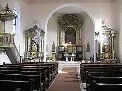 Im Dorfmittelpunkt von Horben steht die katholische Pfarrkirche St. Agatha. Sie wurde 1792 anstelle einer früheren Kapelle in exponierter Lage auf der Hangkante zum Bohrertal errichtet, als das Dorf im Rahmen des Josephinismus erstmals eine eigenständige Pfarrei wurde. Das barocke Portal wurde bereits im Jahr 1703 von Johann Adam Wissen für die frühere Freiburger Heiliggeistspitalkirche geschaffen, die jahrhundertelang dort an der Ecke der Kaiser-Joseph-Straße zur Münsterstraße gestanden hatte und 1805/06 aufgehoben wurde.[7] Im Giebelfeld erinnert die Heilig-Geist-Taube daran. Auch die Innenausstattung wurde erst 1823 von dort nach Horben versetzt, ist aber ebenfalls deutlich älter. Am barocken Hochaltar in warmen Blaugrau- und Rottönen ist ein Altarbild des Waldkircher Malers Johannes Winterer angebracht, welches das Pfingstwunder darstellt. Der rechte Seitenaltar stellt die Patronin St. Agatha dar, der linke ist der Mutter Gottes geweiht. Ebenfalls aus der Kirche des Heilig-Geist-Spitals in Freiburg stammt die Glocke von 1751 mit dem Namen ihres Stifters Johann Friedrich Fridolin von Kageneck. Die Orgel – erbaut 1812 durch Nikolaus Schuble (1770–1816) aus Pfaffenweiler – weist von diesem Meister neben dem historischen Prospekt (Orgel) die einzigen erhaltenen Register auf. Die Kirche ist im Originalzustand erhalten, frisch renoviert und wird auch als Hochzeitskirche genutzt. Daneben befinden sich das Pfarrhaus von 1791 und der Friedhof mit Blick in das Bohrertal.