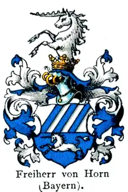 Am 17. März 1783 wurde Wilhelm Joseph Horn, kurpfälzischer Regierungsrat und Landschreiber zu Lautern, der Adelsstand mit Prädikat „von“ und Lehenberechtigung verliehen.[1] Am 16. März 1791 folgte für seinen Sohn Johann Philipp von Horn, kurfürstlich-pfalzbayerischer Hofgerichtsrat und Landschreiber des Oberamts Lautern, der kurfürstlich-pfalzbayerische Freiherrenstand. Für denselben folgte am 3. Januar 1813 von Kaiser Napoleon I. der französischer Baron de l'Empire sowie am 14. April 1819 die Immatrikulation beim Königreich Bayern. Er war verheiratet mit einer Gräfin von Wiser-Siegelsbach. Aus dieser Ehe entspross Wilhelm Freiherr von Horn († 1847), königlich-bayerischer Kämmerer, Generalmajor und Brigadier der 4. Armee-Division. Aus dessen Ehe mit Anna Maria Hager stammen:[2]