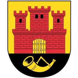 Blasonierung: Das Wappen der Gemeinde zeigt einen Schild mit einer roten Burg auf goldenem Grund mit schwarzem Fuß; im schwarzen Fuß ein mit dem Mundstück nach rechts weisendes goldenes Horn.