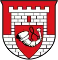 Blasonierung:„In Rot ein silberner (weißer) fünfzinniger Burgturm mit roter Schießscharte, im unteren Teil belegt mit einem roten Wappenschild, darin ein linksgerichtetes silbernes (weißes) Horn.“