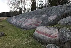Im Hornesfeltet, östlich und nahe dem Riksveg 110, sind 21 Schiffsbilder nahezu in Kiellinie, 15 Schälchengruppen und eine große Männerfigur in einen fast senkrechten Felsaufschluss geschnitzt worden (Lage). Das größte Schiff ist fast drei Meter lang. Die Boote haben einen Rumpf und senkrechte Linien, die die Besatzung der Hochseeschiffe darstellen.