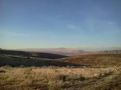 Die Horse Heaven Hills entlang des Columbia River an der Wallula Gap; bemerkenswert sind die dunklen Bereiche aus Basalten, die von der Erosion zutage gebracht wurden. | |