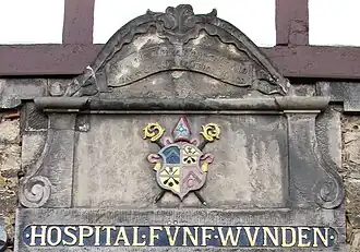 1770 wurde in Hildesheim ein großes Fachwerkhaus gebaut, das zwei verschiedene Krankenhäuser beherbergte, die bereits mehrere Jahrhunderte zuvor gegründet worden waren. Das Erdgeschoss wurde dem Hospital zu den Fünf Wunden und die oberen Stockwerke dem Hospital Sankt Nicolai übergeben. Später führte man beide Krankenhäuser als Vereinigte Hospitäler zusammen. Das Gebäude behielt jedoch den Namen Hospital zu den Fünf Wunden.[3] Der Name leitet sich von der Verehrung der heiligen Wunden ab, die Jesus bei der Kreuzigung zugefügt wurden. Ab dem 19. Jahrhundert wurde das Gebäude vom nahegelegenen St.-Bernward-Krankenhaus genutzt.
