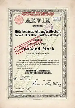 Im Jahr 1904 erwarb die Hotelbetriebs-Aktiengesellschaft (Kempinski AG bis 1926; danach Aschinger bis Kriegsende) das Hotel Bristol (Unter den Linden). Dabei zahlte das Unternehmen für das Grundstück Unter den Linden über 10 Millionen Mark, während es das mit 1,2 Millionen Mark Buchwert taxierte Grundstück Behrenstraße im Zuge der Liquidation der Firma Conrad Uhl’s Hotel Bristol AG übernahm.[2]