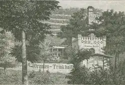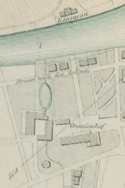 Die 1838 wiederentdeckte Oranienquelle auf der Oranienwiese in der Nähe des Oranienhofes[11] war 1840 von Justus von Liebig und Friedrich Ludwig Knapp chemisch analysiert worden.[12] C. F. Pitthan ließ die Quelle fassen und das Wasser durch eine Dampfmaschine anheben, davon wurde seit 1841 eine Soleleitung für das Hotel gespeist[13] und auf dem Hotelgelände ein Springbrunnen betrieben. Neben der Oranienquelle wurde eine Trinkhalle errichtet, in dem die Sole an alle Kurgäste kostenlos zum Trinken abgegeben wurde.[14]