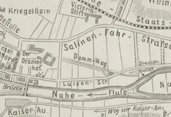 - ↑ Vgl. Wilhelm Tönsmann (Hrsg.): Adressbuch von Stadt Kreuznach, der Salinen Karls- und Theodorshalle und Bad Münster am Stein. R. Voigtländer, Kreuznach 1887, S. 1 und 56; Adreßbuch von Stadt und Kreis Kreuznach. 14. Aufl. R. Voigtländer Nachfolger P. Doepgen, Kreuznach 1912, S. 4, 109 und 122.