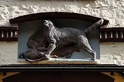 Am Hotel ist das Relief des namengebenden Tieres über einem gerissenen Vogel zu sehen.