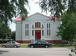 Der Eingang zu dem Gebäude liegt innerhalb des vorspringenden mittleren Joches. Die Türe wird von hölzernen Pilastern flankiert, Seiten- und Oberlichter mit Buntglas liegen unter einem großen Bogen. Auf beiden Seiten des Bogens befindet sich ein Paar hoher, schmaler Buntglasfenster mit hufeisenförmigen Bogen. An den Seiten des Gebäudes finden sich je fünf solcher Fenster, von denen einige verändert wurden.[1]