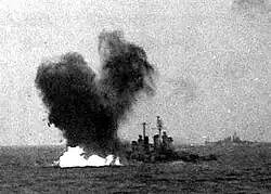 Canberra (vorn) und Houston werden nach Torpedotreffern abgeschleppt -