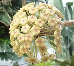 Der ballförmige Blütenstand steht gewöhnlich aufrecht und enthält 50 bis 100 Einzelblüten. Er hat einen Durchmesser bis etwa 15 cm. Der Blütenstandsstiel ist dick und 2 bis 8 cm lang. Die gelblich-weißen Blütenstiele sind mit 2 cm etwa gleich lang. Die rötlichen Kelchblätter dreieckig-eiförmig und etwa 1 mm lang, Die Blütenkrone hat einen Durchmesser von 1,5 bis 2,0 cm mit stark zurück gebogenen, dreieckigen Kronblattzipfeln mit umgebogenen Spitzen. Die kahlen Kronblattzipfel sind an der Basis eher weißlich, zu den Spitzen hin mehr gelblich. Die weißliche Nebenkrone hat einen Durchmesser von 8 mm und eiförmige Zipfel. Der innere und äußere Fortsatz laufen spitz zu. Die Pollinia sind länglich mit gerundetem Apex. Die Caudiculae sind kurz und dick, und verdreht. Das rötliche Corpusculum ist kurz. Früchte und Samen wurden bisher noch nicht beobachtet. Die Blüten verströmen einen angenehm süßlichen Duft und halten sich zwei bis vier Tage.
