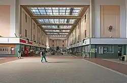 Während der sechsjährigen Bauzeit entstanden zwei langgestreckte Bahnhofsgebäude, die sich an jeweils einer ihrer Kopfseite berühren und in diesem Bereich einen 46[1] Meter hohen Turm umfassen. Der linke Gebäudeflügel dient vorrangig dem Aufenthalt und dem Service für die Reisenden. Im rechten Gebäudeflügel ist der Hauptteil der Verwaltungsräume untergebracht. Der Komplex ist insgesamt 152 Meter lang. Seine Grundfläche umschließt ein Areal von etwa 5000 Quadratmetern.