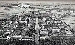 Nachdem ein Teil des Schlosses durch Egidius Dotter als Wanduhrenfabrik genutzt wurde, eröffnete 1838 eine Vereinigung der Hospitäler St. Jakob Dresden und St. Georg Döbeln als neues vereinigtes Landeshospital Hubertusburg. 1853 wurde dem Hospital eine Abteilung II hinzugefügt. Grundvoraussetzung zur Spitalaufnahme war ein Mindestalter von 50 Jahren und eine entsprechende Bedürftigkeit.[12]