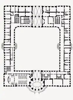 Der Umbau des dreiflügeligen Hauptgebäudes zur heute erlebbaren viertelkreisförmigen Rundflügelanlage zog sich in drei Etappen bis ins Jahr 1752 hin. Hierbei waren zu diesem Zeitpunkt große Teile der künstlerischen Kräfte der kursächsischen Residenz mit Ausstattung und Inneneinrichtung von Schloss Hubertusburg beschäftigt. Mit dem Bau der Viertelkreisflügel sollte der schlichte, einfache und ländliche Charakter der ersten Anlage architektonisch überwunden werden. Die Pläne dazu lieferte der Oberlandesbaumeister Johann Christoph Knöffel. Nach seinem Tod beendete sein Nachfolger Julius Heinrich Schwarze die Umbauarbeiten am Hauptpalais.[8] Besonders prunkvoll wurden die Repräsentationsräume in der ersten Etage und der Westflügel mit dem großen Hubertussaal ausgestattet. Für die Stuck- und Marmorarbeiten der Innenräume war der italienische Künstler Pietro Luigi Bossi (1690–1747) aus Porto Ceresio zuständig.[9] Eine elegante Treppenanlage mit Vorsaal für das spanische Hofzeremoniell führte zu diesem Saal hinauf.[10] 1737 erfolgte der Bau des neuen Jägerhofes, bestehend aus zwei parallel laufenden Reihen zweistöckiger Wohngebäude, der den Namen Französischer Jägerhof erhielt.[5] Darin untergebracht waren das Jagdpersonal, die Stallungen und Zwinger, Vorrats- und Sattelkammern, die Arbeitsräume des Jagdsattlers und -schneiders, dann die Schlafkammern der Hundeburschen und Reitknechte. Weiterhin befanden sich im Jägerhof die Unterkünfte des Jagdbäckers, des Rossarztes, des Wagenmeisters und des Jagdschmiedes.[5] Nach der Fertigstellung des Französischen Jägerhofes wurde der Deutsche Jägerhof zum Küchenhof umgestaltet.[11] Diese Veränderung der Königlichen Mund-Marschall-Tafel und Bey-Küche war durch die Vergrößerung des Hofstaates nötig geworden. Dazu wurde 1745 der Lust- und Küchengarten bis an den Weg, der Wermsdorf mit Mutzschen über den vorderen Horstseedamm verbindet, vergrößert.[11] 1739 wurde der ganze östliche Flügel bis auf den Grund abgetragen.[12] Der sächsische Premierminister Graf Heinrich von Brühl nahm eine Sonderstellung innerhalb des Hubertusburger Hofes ein und besaß ein eigenes Palais. 1740–1751 entstand die noch vollständig vorhandene Schlosskapelle im Rokoko-Stil.