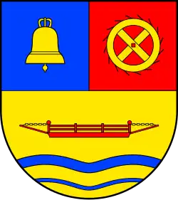 Blasonierung: „Halb gespalten und geteilt. Oben rechts in Blau eine goldene Glocke, oben links in Rot ein goldenes Mühlrad, unten in Gold über einem schmalen und einem breiteren blauen Wellenfaden ein roter Prahm.“[9]