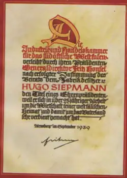 Siepmann, im Volksmund auch als Schippen-Hugo bezeichnet, betätigte sich mit dem Vertrieb der unveränderten Produkte die vor allem im landwirtschaftlichen Bereich Anwendung fanden. Die Firma wurde mit der Zeit komplett auf Gesenkschmiede umgestellt. 1916 wurde ein neuer Hammer mit einer 85-Tonnen-Schabotte aufgebaut, der zu dieser Zeit schwerste Hammer in einem Produktionsbetrieb in Deutschland. Für seinen Transport ins Siepmannsche Werk mussten alle Brücken zwischen Soest und Warstein verstärkt werden. Die Firma war seit der Jahrhundertwende ein wichtiger Zulieferer für die Fahrrad- und später für die Automobil- und Eisenbahnindustrie. Siepmann war auch als Mäzen tätig. Seine erste öffentliche Spende waren 5 Goldmark (ungefähr €5'000 im Jahr 2024) an das Windhuker Kriegerdenkmal in Deutsch-Südwestafrika.[2] 1921 stifteten die Gebrüder Siepmann 250'000 Mark für den Bau des Kinderheims Warburg auf Norderney. Siepmann hatte zahlreiche Ehrenämter inne und war bis zuletzt im Vorstand der Warsteiner Sparkasse vertreten.