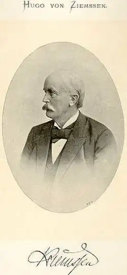 - ↑ Wolfgang G. Locher: Ziemssen, Hugo Wilhelm von. In: Werner E. Gerabek, Bernhard D. Haage, Gundolf Keil, Wolfgang Wegner (Hrsg.): Enzyklopädie Medizingeschichte. De Gruyter, Berlin / New York 2005, ISBN 3-11-015714-4, S. 1529 f.; hier: S. 1529.