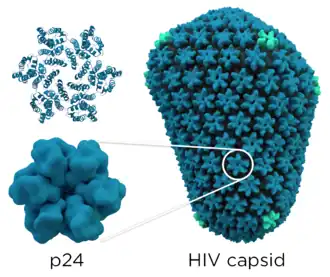 Mit der Innenseite der Membran sind die durch gag codierten Matrixproteine p17 assoziiert. Im Inneren des Virions findet sich das Viruskapsid, das aus den durch gag codierten Kapsidproteinen p24 aufgebaut ist, deren Struktur schrittweise 1996[15] und 1997[16] aufgeklärt wurde. Das Kapsid besteht aus etwa 1500 Kapsidproteinen und nimmt dabei eine Fulleren-ähnliche, konische Struktur ein, dieses Strukturmodell wurde erstmals 1999 vorgeschlagen.[17] 2013 wurde mittels Kryoelektronenmikroskopie die dreidimensionale Struktur mit einer Auflösung von 8 Å abgebildet.[18] p24 formen mit etwa 250 Hexameren und genau 12 Pentameren das Kapsid.[19][20]