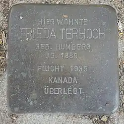 Frieda Humberg, am 17. Dezember 1889 geboren,[31] war die jüngste Tochter. Sie heiratete den Händler Adolf Terhoch aus Drensteinfurt, mit dem sie 1921 die Zwillinge Kurt und Rudi (Rudolf) bekam. Die vier aus Ramsdorf konnten im September 1937 in die Niederlande, 1939 dann nach Kanada fliehen, wo sie sich in Winnipeg niederließen.[32][33][34] Kurt und Rudi besuchten 1989 erstmals wieder Ramsdorf; in Kanada haben sie ihr Erwerbsleben lang als Elektriker in einer Elektrofirma in jüdischem Besitz gearbeitet. Frieda (in Kanada: „Freda“) führte in Winnipeg einen koscheren Partyservice und Imbiss, denn Winnipeg hat eine der größten jüdischen Gemeinschaften im Land. Von den insgesamt 6 Nachkommen der beiden Zwillinge sind drei bereits als Besucher im Humberghaus erschienen. Ein als Aussteuer mit den Initialen „F. T.“ bestickter Kissenbezug gelangte 2018 zurück nach Dingden, aus Anlass des Besuchs von Friedas kanadischer Ururenkelin Jocelyn im Gedenkort.[35]
