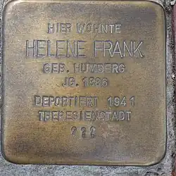 Helene Humberg, geb. 1886, heiratete den Viehhändler und Metzger Abraham Frank (geb. 1872) im Nachbarort Velen und bekam mit ihm zwei Kinder, Edith und Siegfried. Gut in die Ortsgemeinschaft integriert, blieb die Familie Frank auch nach der Zwangsschließung der Metzgerei in Velen. Am 13. Dezember 1941 wurden Helene und Abraham Frank via Münster-Bielefeld nach Riga deportiert und dort ermordet.[21] In der Bahnhofsallee in Velen wurde 2012 ein Stolperstein für Abraham Frank und die anderen Franks verlegt. Die Abraham-Frank-Schule in Velen, mit zweitem Standort in Ramsdorf, ist nach ihm benannt, stellvertretend für alle ermordeten Juden des Orts.[22][23][24]