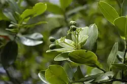 Die wechselständig an den Zweigen angeordneten Laubblätter sind gestielt bis sitzend oder pseudo-gestielt. Die kahle, einfache, mehr oder weniger ledrige, dünne oder dicke, flexible oder oft steife Blattspreite ist in der Form variabel. Häufige Spreitenformen sind elliptisch, verkehrt-eiförmig oder länglich. Die Spreitenbasis ist meist etwas herablaufend, bei einigen Varietäten ist sie mehr oder weniger spitz zulaufend, keilförmig bis stumpf, manchmal abrupt in einen geflügelten Blattstiel verschmälert, seltener abgerundet bis stumpf. Das obere Ende der Blattspreite ist beispielsweise abgerundet bis stumpf oder gestutzt und öfters eingebuchtet, manchmal stachelspitzig, bis spitz oder zugespitzt. Die auch bzgl. der Größe sehr variable Spreite kann eine Länge von 18 cm und eine Breite von 7 cm erreichen. Die Blattoberseite ist kahl oder selten behaart. Die Mittelrippe ist auf der Blattoberseite auffällig und auf der Blattunterseite erhaben. Die Blattunterseite ist nahe dem Blattrand drüsig punktiert. Die dünnen Seitennerven sind bei einem Abstand von 3 bis 5 mm ausgebreitet, etwas erhaben sowie auffällig und gebogen; sie vereinigen sich nahe dem Spreitenrand. Der Blattrand ist ganz bis schwach gekerbt. Die Nebenblätter sind klein und fallen früh ab oder fehlen.[1]