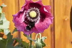 Hummel mit Pollenpäckchen („Höschen“) in Schlafmohn-Blüte, einer „Pollenblume“