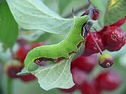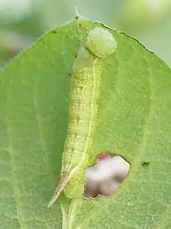 Die Raupen erreichen eine Körperlänge von 35 bis 40 Millimetern. Sie sind nach dem Schlüpfen etwa drei Millimeter lang und haben eine hellgelbliche Färbung. Ältere Raupen sind kräftig hellgrün gefärbt und tragen beidseits des Rückens eine helle Längslinie. Die gesamte Körperoberfläche ist sehr rau und mit zahlreichen kleinen hellen Punktwarzen bedeckt. Die Bauchseite der Tiere ist deutlich abgesetzt dunkelbraun gefärbt. Gelegentlich treten auch komplett braun oder golden gefärbte Raupen auf. Um die Stigmen befindet sich bei ausgewachsenen Tieren je ein rötlicher Fleck. Das Analhorn ist zunächst dunkel, später an der Basis rötlich und zur Spitze hin bräunlich gefärbt.