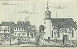 - Die einschiffige Kirche mit einer Holzdecke wurde 1784–1788 anstelle eines Baus aus der zweiten Hälfte des 16. Jahrhunderts[9] errichtet, der alte Turm blieb erhalten.[10] Richard Steche nennt sie „architekturlos“, stellt aber das Taufbecken aus Messing von um 1500, den hölzernen Taufstein, der die Jahreszahl 1792 trägt und noch im Rokokostil gearbeitet sei, sowie einen kupfernen Kelch von 1760 als „gute Rococo-Arbeit“ heraus.[10]