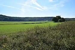 Der Hungersee liegt trocken. Nur an der tiefsten Stelle ist noch Schilfbewuchs vorhanden, was einen weiterhin feuchten Untergrund belegt.