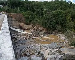 In North Carolina traten am 27. September die schwersten Überschwemmungen ein. Der Westen von North Carolina war infolge von Überflutungen und Erdrutschen weitgehend von der Außenwelt abgeschnitten.[42] Allein mindestens 72 bestätigte Todesfälle gab es im Buncombe County in der Gegend um Asheville in den Blue Ridge Mountains.[51] Dort erreichten die Flüsse French Broad River und Swannanoa River nie zuvor gemessene Pegelstände von 7,5 bzw. 8 Metern; der Normalpegel liegt jeweils bei rund 46 Zentimetern.[52] Die besonders schweren Auswirkungen in North Carolina rührten von einer Kaltfront, die kurz vor Eintreffen des Hurrikans bereits bis zum Morgen des 26. September, 9 Uhr, in Asheville rund 180 mm Regen brachte. Die Böden waren daher schon vollkommen gesättigt und der Pegel der Flüsse allein durch dieses Regenereignis bereits auf rund 5 Meter angestiegen.[53][54] Orte wie Chimney Rock am Oberlauf des Broad River wurden völlig zerstört und praktisch „von der Landkarte radiert“.[55] Am 7. Oktober waren in North Carolina immer noch über 130.000 Menschen von der Stromversorgung abgeschnitten.[56]