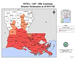 - ↑ FEMA: Louisiana Aid Deadline Looms, 153,000 Have Applied. FEMA, 2002, archiviert vom am 1. März 2012; abgerufen am 8. November 2008 (englisch).