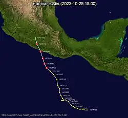 Am 22. Oktober bildete sich südlich von Südmexiko das Tropische Tief 18-E[1], das noch am gleichen Tag zum Tropischen Sturm Otis heraufgestuft wurde.[2] Nach einem graduellen Verstärken des Sturms setzte am 24. Oktober eine rapide Intensivierung ein, bei der sich Otis in nur 12 Stunden von einem Tropensturm bis zu einem Kategorie-5-Hurrikan mit 270 km/h Windgeschwindigkeit verstärkte. Am 25. Oktober 06.25 UTC, also kurz nach Mitternacht Ortszeit (UTC–6), traf er mit dieser Windgeschwindigkeit bei Acapulco auf Land. Dabei zog der rechte Quadrant des Hurrikans, in dem die stärksten Wind herrschen, über die am stärksten verdichteten Gebiete von Acapulco, sodass bei Otis (eventuell mit Ausnahme von Hurrikan Andrew) möglicherweise mehr Menschen Kategorie-5-Windgeschwindigkeiten ausgesetzt waren als bei jedem anderen bekannten Hurrikan.[3] Nach dem Landfall schwächte sich Otis schnell ab und löste sich noch am 25. Oktober auf.[4]