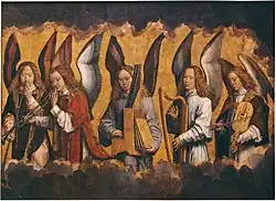 Informationen zu Fideln aus dem 15. Jahrhundert sind zu einem großen Teil Johannes Tinctoris zu verdanken. Bis dahin französisch viele genannt, hießen die von der byzantinischen lira abstammenden Streichinstrumente ab dem 15. Jahrhundert französisch viole oder vyolon, englisch vyell, italienisch viola, niederländisch vedel und später deutsch Fiedel.[42] Gemeinsam ist den Fideln eine der späteren Violine ähnliche Haltung und Spieltechnik. Tinctoris unterschied bei den gestrichenen viole drei Formen: eine mit einem flachen Boden und mehr oder weniger stark taillierten Seiten an einem Korpus, der kleiner als derjenige der Laute ist. Eine zweite viole, von der man glaubte, sie sei von den Griechen eingeführt worden, hat eine etwas andere Form und Besaitung als die Laute. Die dritte Form ist ein kleines, von den Franzosen rebec genanntes Instrument mit einem wie bei der Laute halbrunden (wörtlich testudineum, „schildkrötenpanzerförmigen“) Korpus.[43] Der erste Typ (gitarrenförmiger Korpus, C-förmige Schalllöcher, drei oder fünf Saiten) war während des gesamten 15. Jahrhunderts die typische Form in Westeuropa und blieb weiterhin als Nischeninstrument in der Volksmusik erhalten, während sich im 16. Jahrhundert die heutige Form der Violine durchsetzte.