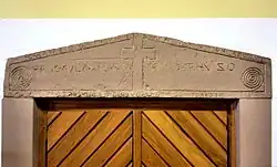 „Diese Christus geweihte Halle errichtete Huso. Die Tür steht offen; wer rechte Wünsche hat, trete ein. Hier erhört ihn der Herr, hier befreit er die (von Sünden) Gefesselten und macht, daß der, welcher die Fesseln (der Sünde) von sich wirft, nicht stirbt, sondern ewig lebt“.[3][4]