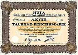 In der zweiten Hälfte des Jahres 1942 war die Huta über ihre Filiale in Kattowitz unter anderem an Baumaßnahmen in Auschwitz, so zur Errichtung der Krematorien beteiligt.[1][2][3] In dieser Zeit befand sie sich unter maßgeblichem Einfluss der Dresdner Bank, die 26 Prozent der Aktien hielt und den Aufsichtsratsvorsitz über den stellvertretenden Leiter der Filiale in Breslau innehatte. Der Wirtschaftshistoriker Johannes Bähr, der die Geschichte der Dresdner Bank und ihrer Beteiligungen untersuchte, kam daher zum Urteil, kaum ein Unternehmen sei „dem Zentrum des Holocausts so nah“ gewesen wie die Huta.[4] In Berlin beschäftigte die Huta bei der BEHALA im Osthafen in Berlin-Friedrichshain und in Berlin-Charlottenburg Zwangsarbeiter ebenso ihre Niederlassung in Halle/Saale auf der Baustelle des Zweigwerks Magdeburg der Junkers Flugzeug- und Motorenwerke AG.[5] In der SBZ wurde 1946 aufgrund des Befehls Nr. 124 der SMA das Vermögen der HUTA-Niederlassung Berlin beschlagnahmt.[6]