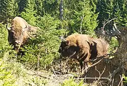 Hutewaldähnliche Landschaften entstanden vor der menschlichen Nutzung durch Herden wilder Weidetiere wie Auerochsen und Wisente (Bild: Wisente im Rothaargebirge)