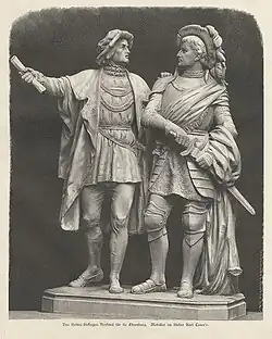 Das Doppelstandbild zeigt möglicherweise den Moment, in dem sich die späteren Freunde im Jahr 1519 zum ersten Mal begegnet sind. Franz von Sickingen lernte durch Ulrich von Hutten die Idee einer Reformation der Kirche kennen. In der dargestellten Begegnungsszene nimmt von Sickingen gegenüber von Hutten aber noch eine ablehnende und misstrauische Haltung ein. Er steht leicht zurückgeneigt da und hält mit beiden Händen sein Schwert, das er sogar leicht aus der Scheide gezogen hat.