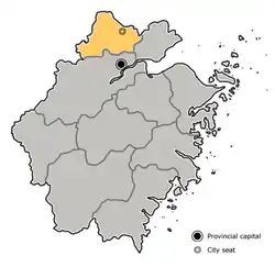 - ↑ citypopulation.de: HÚZHŌU SHÌ, Stadt auf Präfekturebene in Zhèjiāng Shĕng (China), abgerufen am 17. Februar 2022