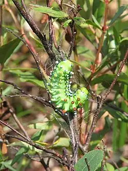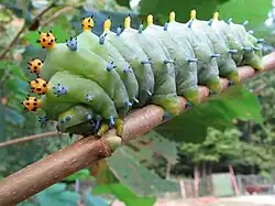 Die Raupen der ersten Stadiums (L1) sind schwarz. Die Raupen des zweiten Stadiums (L2) sind gelblich grün und mit schwarzen Flecken gezeichnet. Die stacheligen Tuberkel sind orange, gelb und blau gefärbt. Die Stacheln des dritten und vierten Larvenstadium (L3, L4) sind kleiner, die beiden Stadien ähneln einander stark. Das fünfte Stadium (L5) ist weißlich, die Tuberkel sind gelb, blau und rot. Die Raupen erreichen eine Länge von bis zu 125 Millimetern.