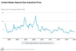 Ein 2008 einsetzender Rückgang des Erdgaspreises auf dem US-Markt, der 2012 in einem Rekordtief mündete, führte dazu, dass sich zunehmend Investoren aus Fracking-Projekten zurückzogen und das Investitionsvolumen von 35 Mrd. $ (2011) auf 7 Mrd. $ (2012) und zuletzt auf 3,4 Mrd. $ (2013) schrumpfte.[40] US-Ökonomen warnen zudem vor einer systematischen Überschätzung der Vorräte an unkonventionellen fossilen Kohlenwasserstoffen.[41] So korrigierte im Mai 2014 die Statistikabteilung des US-Energieministeriums, die Energy Information Administration (EIA), eine 2011 erhobene Schätzung der Ergiebigkeit des vermeintlich wichtigsten Schieferöl-Vorkommens der USA – des sogenannten Monterey-Schiefers in Kalifornien – um 96 % nach unten. Dies entspricht einer Reduktion der geschätzten US-Schieferölreserven um zwei Drittel.[42] Preisverfall und enttäuschte Erwartungen zwangen im Jahr 2013 mehrere Unternehmen dazu, milliardenschwere Investitionen in unkonventionelle Förderprojekte abzuschreiben.[43] Die niedrigen Gaspreise sowie ein Ende 2014 erneut einsetzender Preissturz beim Erdöl wirken sich vor allem auf die kleineren Unternehmen aus. Können diese ihre Kredite nicht mehr bedienen (die Gesamtschuldenlast der US-Frackingindustrie wuchs von 2010 bis Anfang 2015 um 55 % auf ca. 200 Mrd. $), weil ihre Förderanlagen nicht wirtschaftlich arbeiten, müssen sie Konkurs anmelden. Auf den Boom im ersten Jahrzehnt des 21. Jahrhunderts folgte nunmehr eine Phase der Marktbereinigung,[39] wobei sich der Ölpreis allerdings schon 2016 erholte und 2018 mit bis zu 85 US$ neue Höchstwerte erreichte.