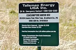 Hinweisschild auf die behördliche Genehmigung einer Brauch­wasser­entnahme­stelle im nördlichen Einzugsgebiet des Susquehanna River (Marcellus Shale Play, Pennsylvania, USA). Die erlaubte maximale Wasserentnahme pro Tag ist mit 6,0 Millionen US-Gallonen angegeben, etwa 23 Millionen Liter.