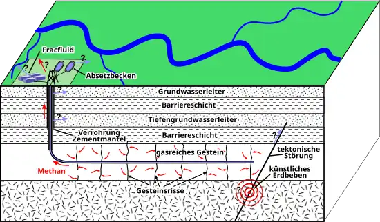 Generell bestehen bei allen Bohrtechniken Umweltrisiken, insbesondere wenn sie mit der Förderung fossiler Kohlenwasserstoffe in Zusammenhang stehen. Diese Risiken sind jedoch beim Fracking zur Förderung von Schieferöl und -gas aufgrund der hohen Anzahl und Dichte an Bohrungen und Bohranlagen einerseits erhöht und zum anderen bestehen zusätzliche Risiken, weil dem Fracking-Fluid Chemikalien, u. a. Biozide, zugesetzt werden.[53][54] Risiken bei der Erdöl- und Erdgasförderung mittels Fracking bestehen im Einzelnen hinsichtlich: